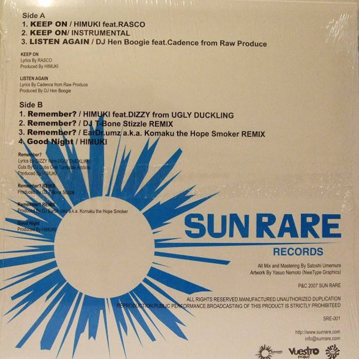 Very Limited 12" vinyl EP previously released in 2007 only in Japan via Sun Rare Records. Artists include Himuki feat. Dizzy Dustin (from Ugly Duckling), Rasco (Stones Throw), DJ Hen Boogie feat. Cadence (from Raw Produce), and remixes by DJ T-Bone Steak, and EarDr.Umz aka Komaku The Hope Smoker!